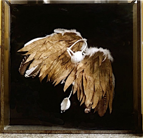 this is the last version, after the photo accident : while taking pictures in the garden of the former sculpture, a sudden and very strong gust of wind sent the whole thing into the ravine behind ! I got back what I could and made this reliquary, just as the gentleman of the legend I invented had done...